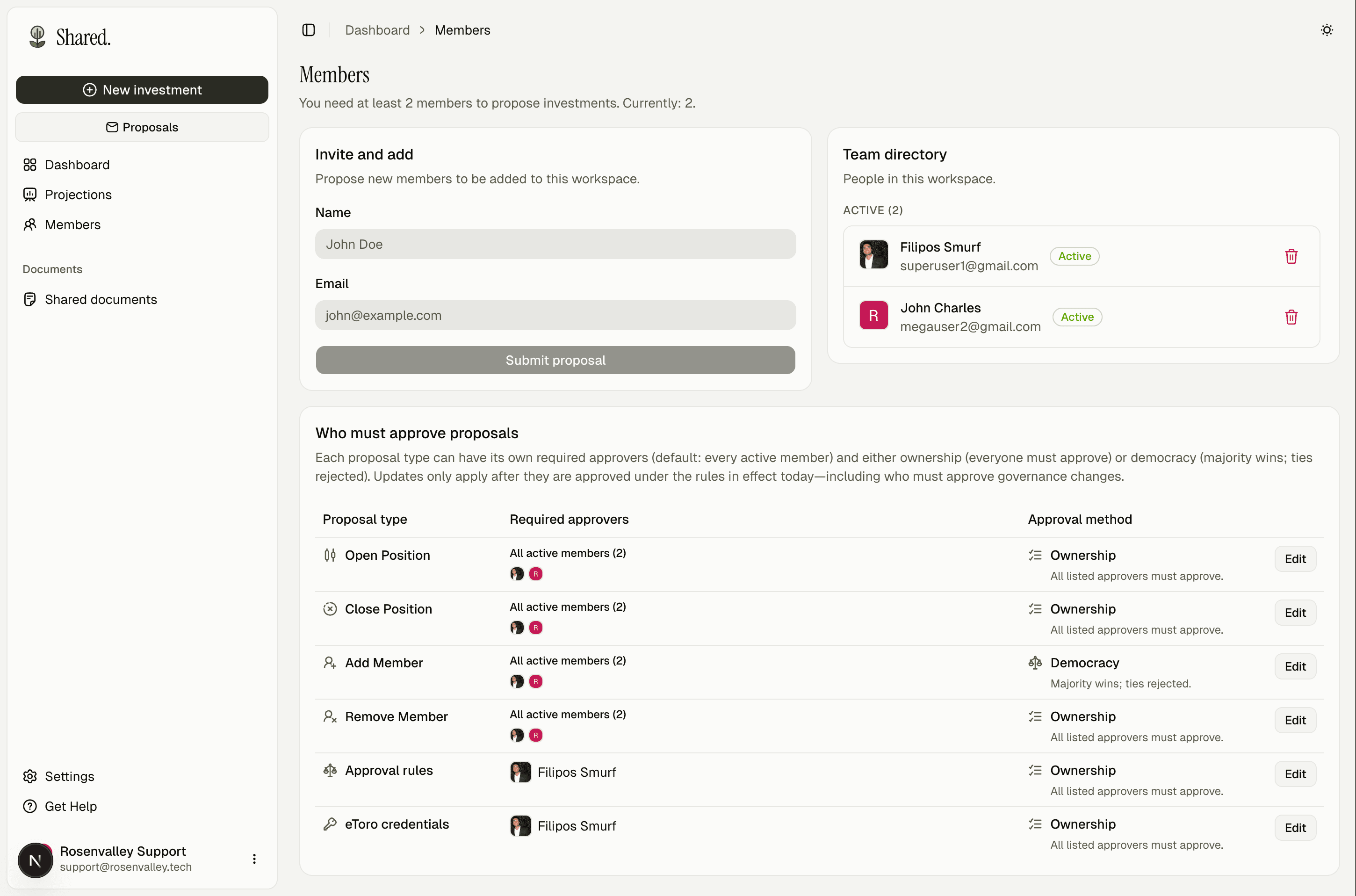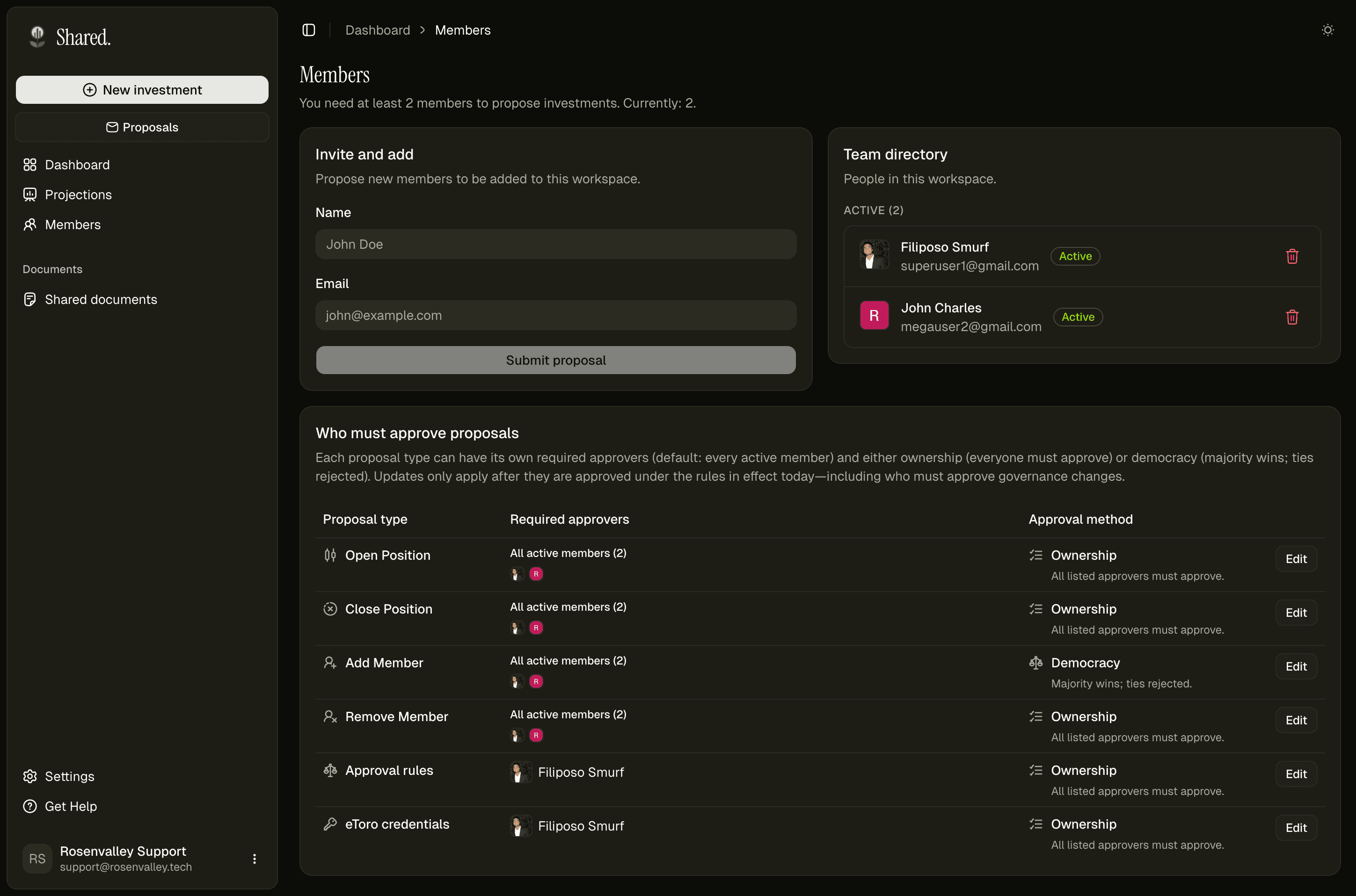 Portfolio owners connect their own eToro API keys and decide exactly who gets access. Members see only what the owner shares — nothing more. Every trade, membership change, and signed document requires a group vote before it takes effect.